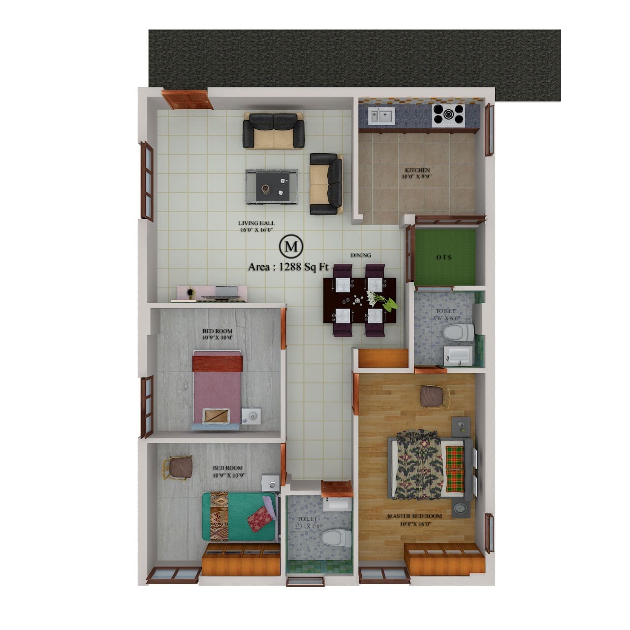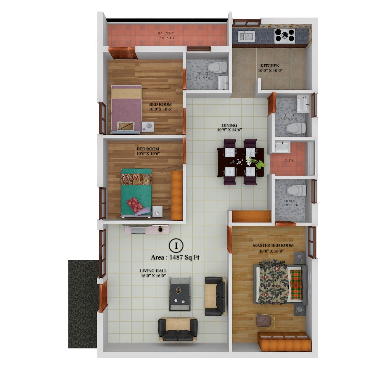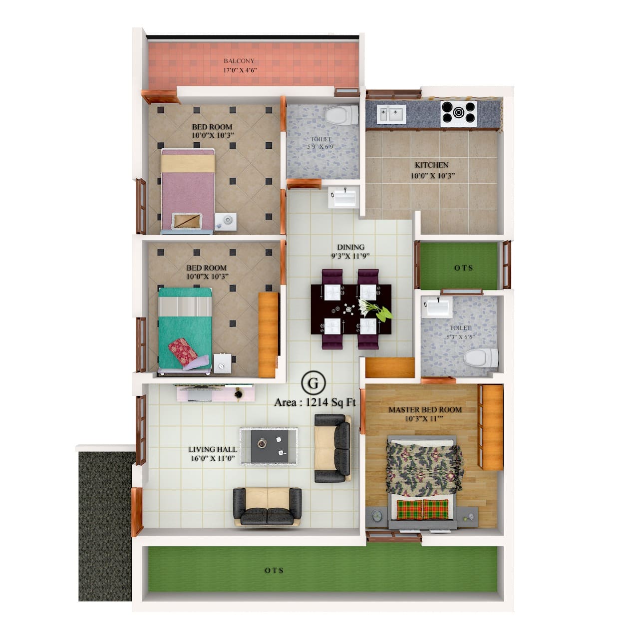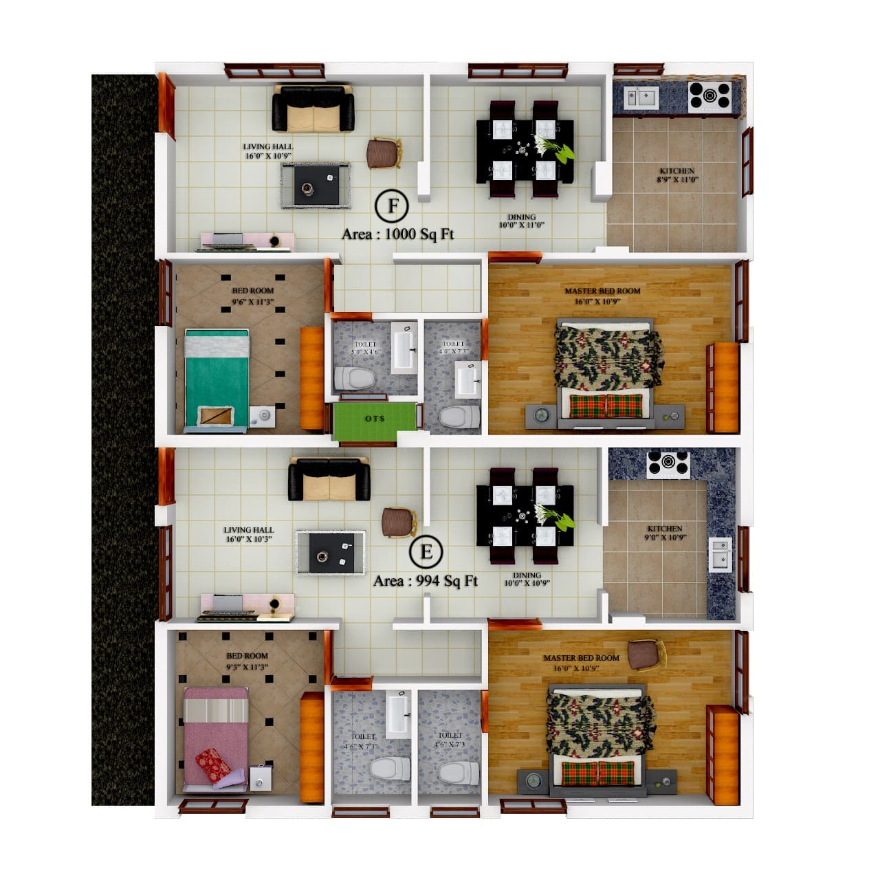 Flat Distribution : Units are compactly designed with living, kitchen, bedroom spaces.