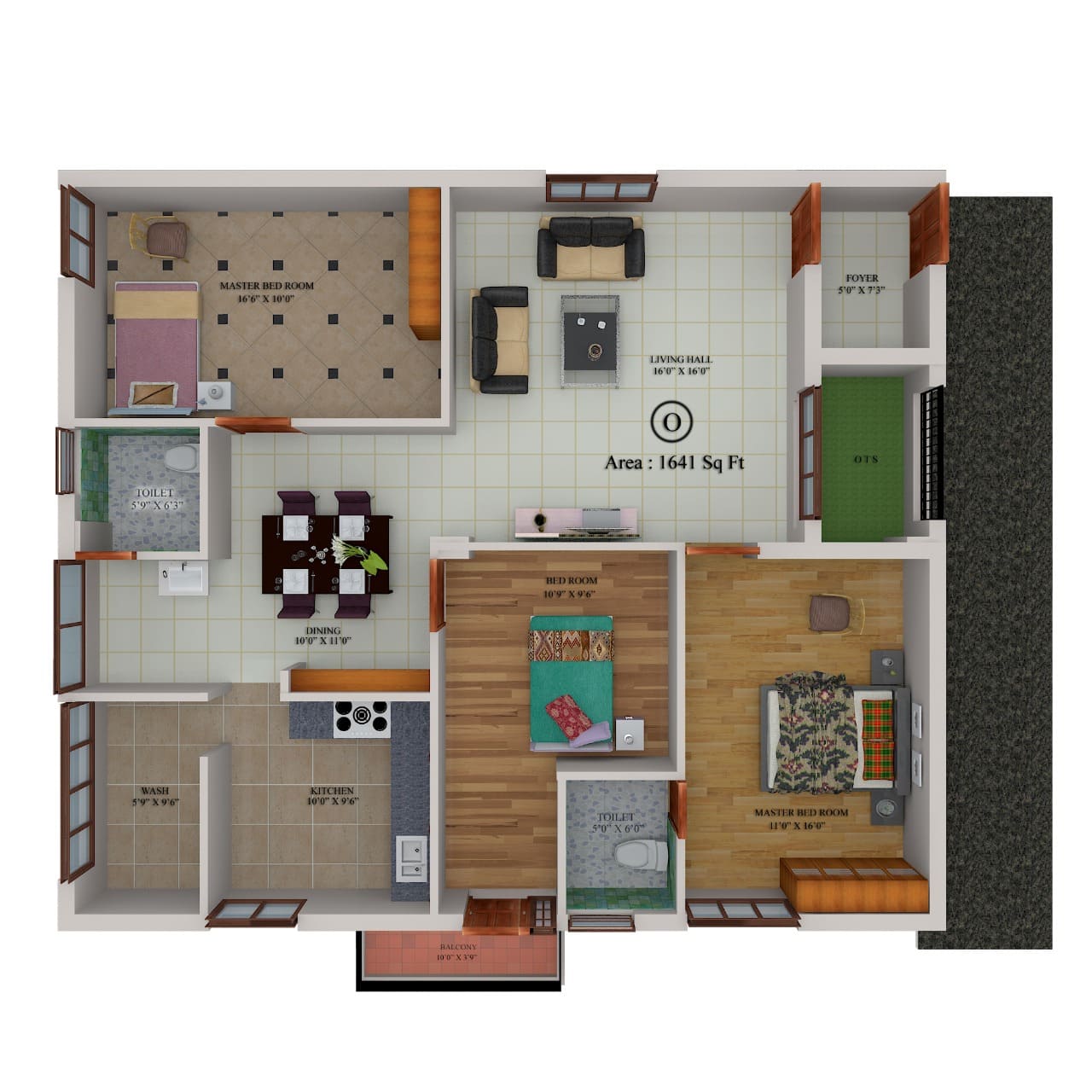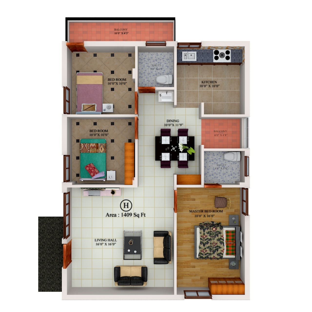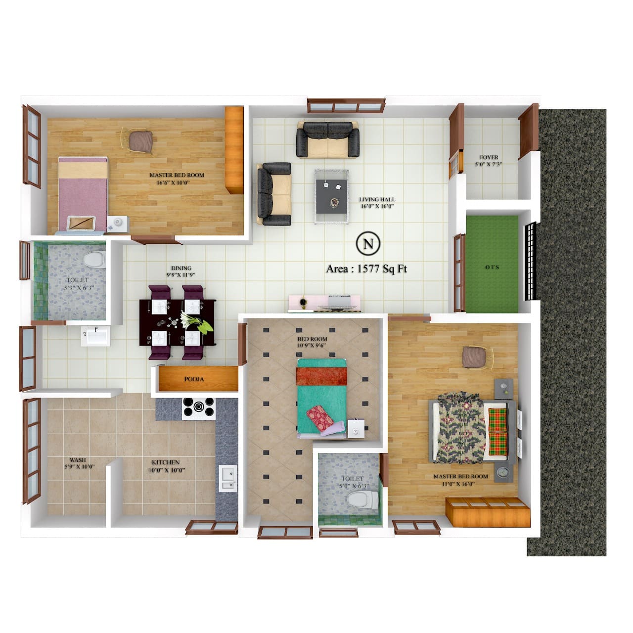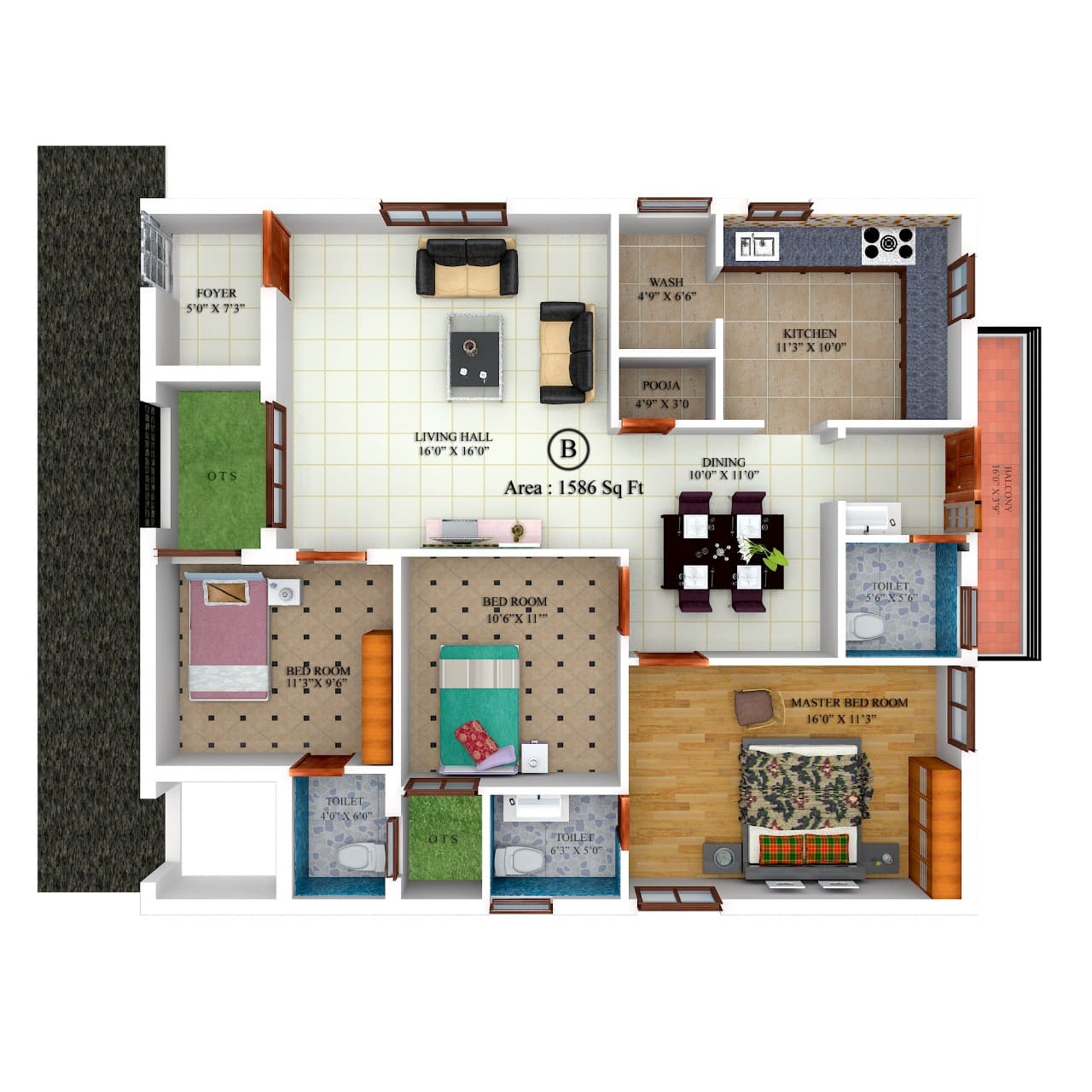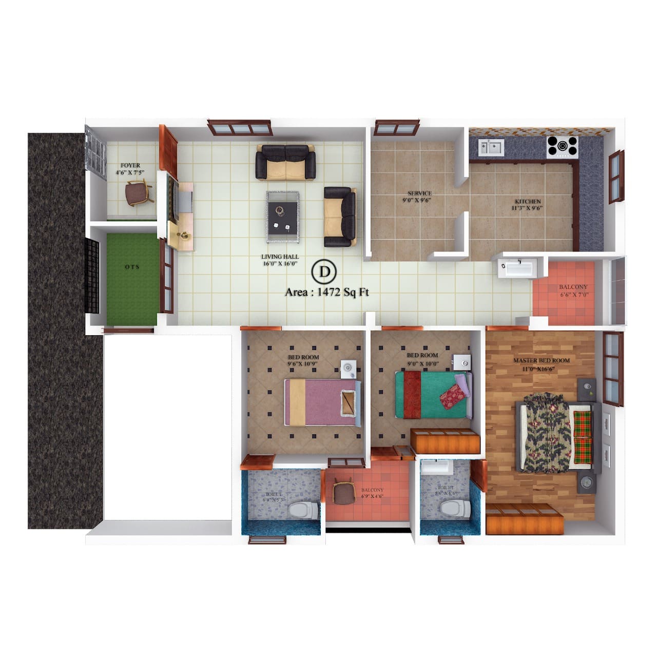 Flat Distribution : Units are compactly designed with living, kitchen, bedroom spaces.